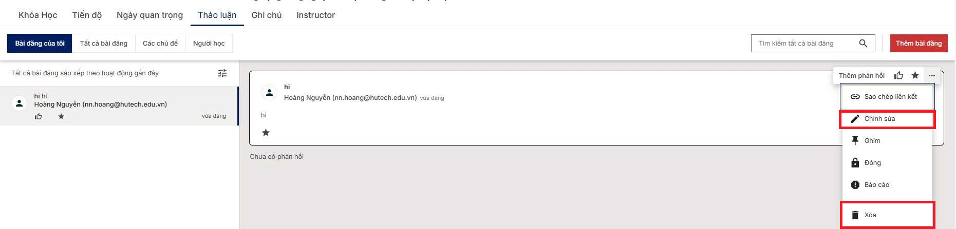 Để chỉnh sửa hoặc xóa bài viết, tìm và nhấp vào nút “Chỉnh sửa” hoặc “Xóa” bên cạnh bài viết của Người học.