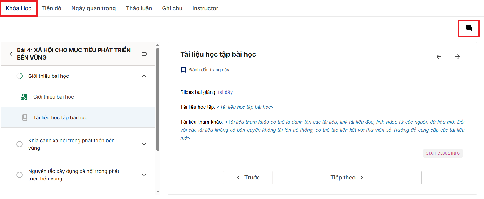 Tại khóa học, nhấp mục Diễn đàn (biểu tượng , thường nằm trên mỗi bài học)