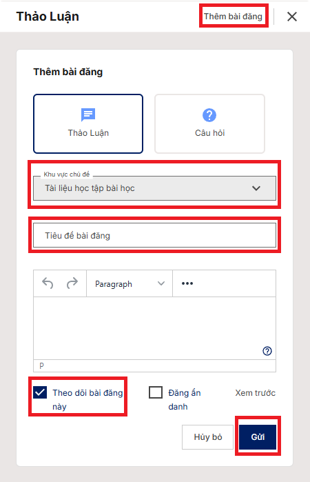 Để tham gia vào diễn đàn trao đổi trong khóa học, Người học có thể làm theo các bước sau: